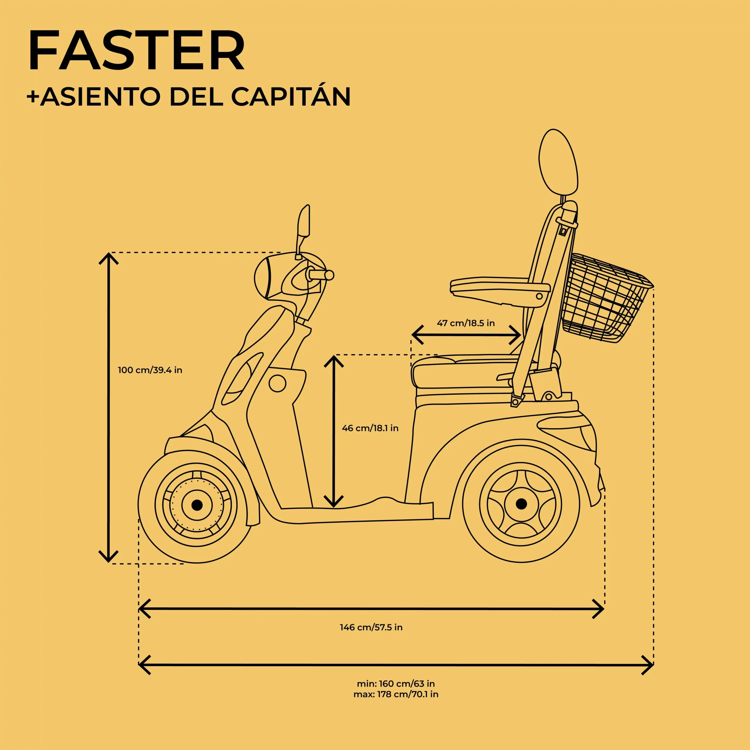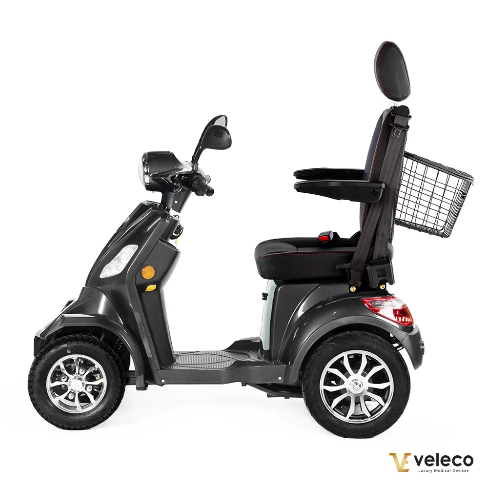 The Veleco FASTER mobility scooter is designed for those who value comfort, safety, and style while navigating both indoor and outdoor environments. This 4-wheel electric scooter is perfect for traversing various terrains with confidence, thanks to its robust build and enhanced stability. The spacious, adjustable captain seat ensures a luxurious riding experience, providing support for your back and arms, while allowing customization for maximum comfort. Whether you’re maneuvering through tight indoor spaces like supermarkets or cruising along outdoor paths, the FASTER scooter’s sturdy design guarantees safety and ease of use.