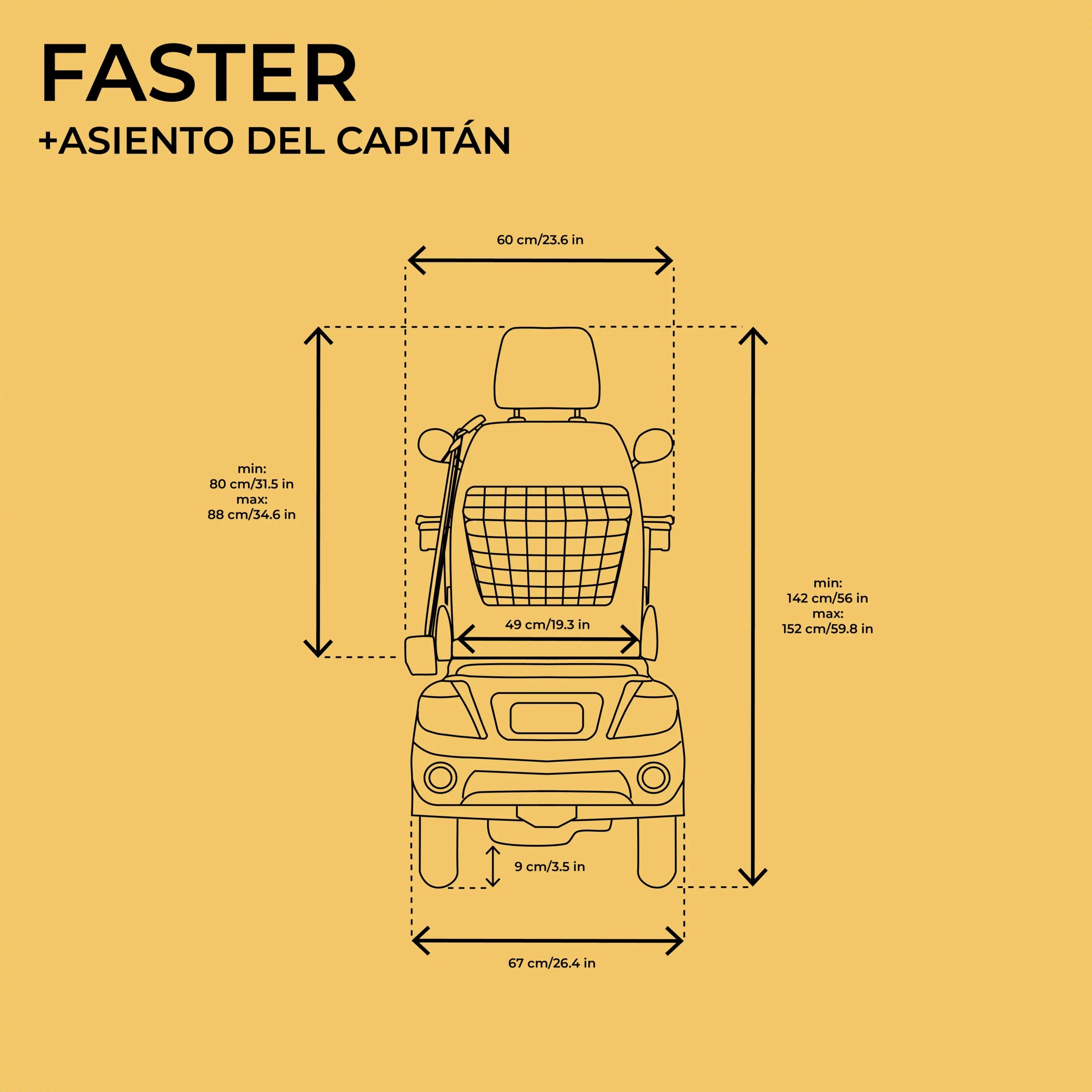 This FASTER model is equipped with a captain’s chair for greater comfort. The seat is characterized by a high backrest with a headrest that can be adjusted up and down to ensure comfort while driving. There are armrests on both sides of the chair, the armrests can be adjusted to the preferred height and raised and lowered. The seat of the chair can also be moved forward and backward. The seat is equipped with safety belts.